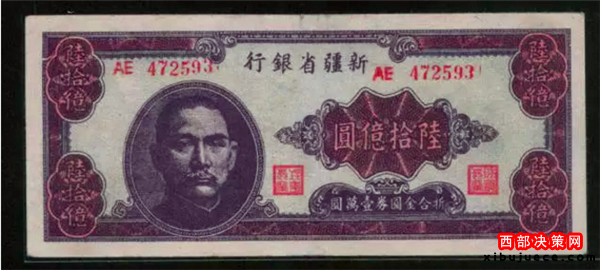 發(fā)行于1949年5月10日,由當時中華民國國民政府的新疆省銀行發(fā)行。