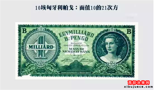 匈牙利帕戈在第二次世界大戰(zhàn)后失去價值,遭受到紀錄上有史以來最嚴重的貨幣貶值,物價飛漲到了無法控制的地步,計價時需要用到極高的位數,面值10垓帕戈的鈔票,舊匈牙利的鈔票,面值是100,000,000,000,000,000,000,也就是10的21次方帕戈(可能紙幣上實在放不下這么多0,所以面額是用文字表示的)。