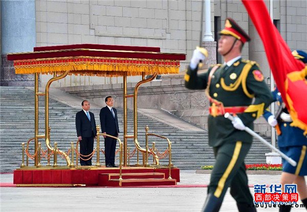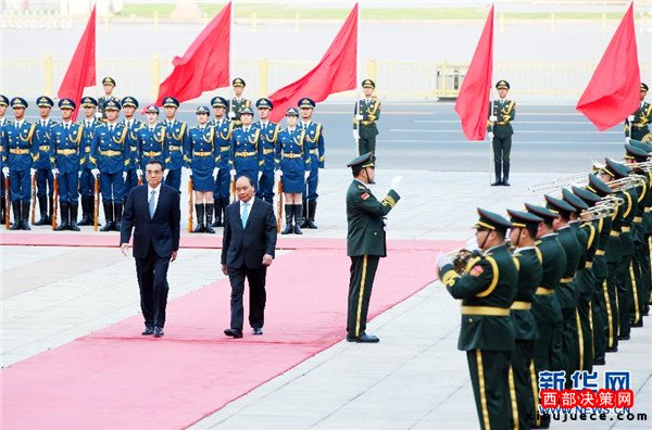 會談前,李克強在人民大會堂東門外廣場為阮春福舉行歡迎儀式。