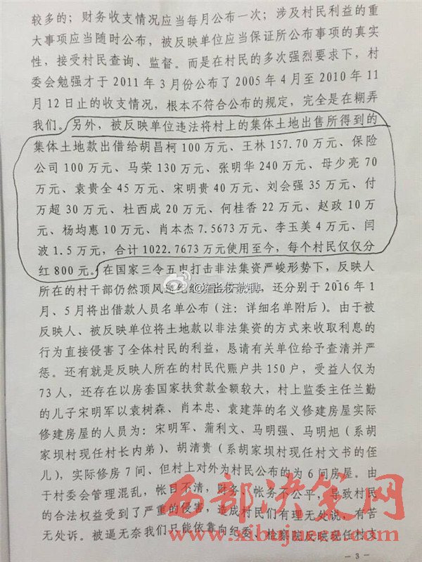 西部決策網(wǎng)訊 近日,有網(wǎng)友微博爆料,陜西省漢中市寧強(qiáng)縣胡家壩鎮(zhèn)胡家壩村,村干部劉全忠利用惠民政策,套取國家大量資金。對于國家扶貧項目,巧立名目、貪污、侵占村民利益。濫用職權(quán)違規(guī)審批宅基地,倒賣村集體土地,并將村上千萬余元出借他人賺取利息,且村務(wù)不公開、賬務(wù)弄虛作假、嚴(yán)重違紀(jì)行為。