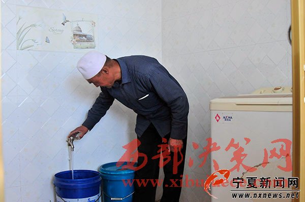 在海原水務(wù)局曹洼水利工作站站長牛志遠(yuǎn)的帶領(lǐng)下,我們來到了白崖村村民馬正海的家。這是個(gè)干凈整潔的院落,兩間并排的磚瓦房,步入屋內(nèi),馬正海正在教老伴如何使用洗衣機(jī)。“50多歲了第一次用洗衣機(jī),還不會(huì)操作呢” ,馬正海的老伴笑著說,“今年4月家里通上自來水,前陣子就去買了臺(tái)洗衣機(jī),這在之前想都不敢想。”