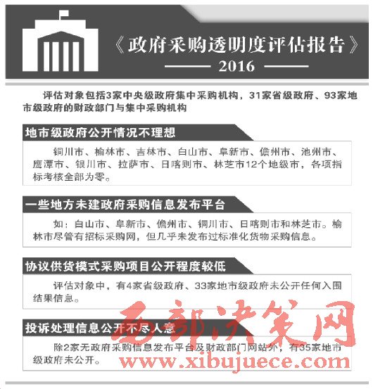 《報告》主要執(zhí)筆人之一、社科院法學所研究員呂艷濱向《法制日報》記者介紹,此次評估分析了3家中央級政府集中采購機構,31家省級政府、93家地市級政府的財政部門與集中采購機構,對他們公開政府采購的批量集中采購模式、協(xié)議供貨采購模式、投訴處理及違規(guī)處罰結果信息,進行透明度考察和評比。