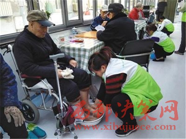 昨日,石景山樂(lè)齡“養(yǎng)老驛站”工作人員為老人洗腳。