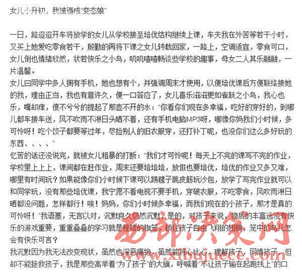 家長(zhǎng)如此不辭辛勞,背后卻也有著道不盡的苦水。武漢一位媽媽就發(fā)出了名為《女兒小升初,我被逼成"變態(tài)娘"》的帖子,講訴自己節(jié)衣縮食,卻給孩子花很多錢報(bào)各種培訓(xùn)班,控訴"變態(tài)的培優(yōu)市場(chǎng)"和不公平的升學(xué)門檻,引來許多家長(zhǎng)共鳴。