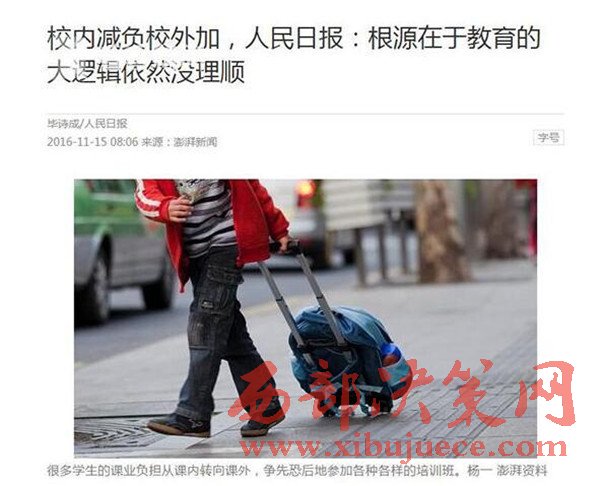 那么到底該從何思考這場(chǎng)學(xué)而思的瘋狂?11月15日出版的《人民日?qǐng)?bào)》表示,校內(nèi)減負(fù)校外加的現(xiàn)象根源在于,教育的大邏輯依然沒有理順。文章說,如果不能將招錄制度的改革做足做透,不能將教育資源均衡化的工作咬定不放松,那么校內(nèi)減負(fù)校外加的怪現(xiàn)狀,就會(huì)變著花樣地持續(xù)上演。