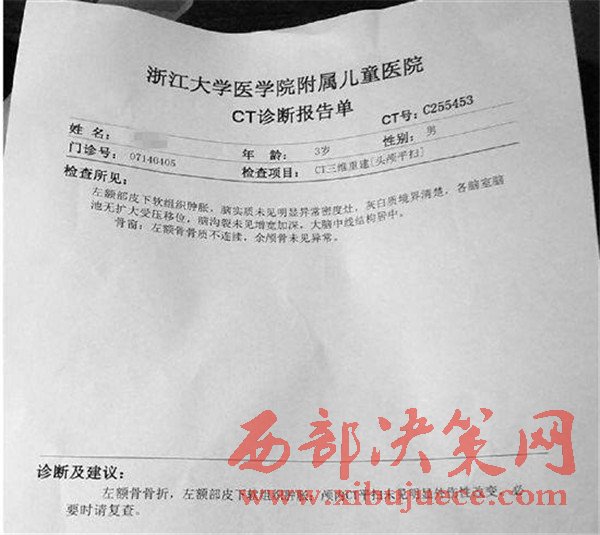 為了確認(rèn)孩子的傷情,我和幼兒園的園長帶著孩子到了杭州的一家醫(yī)院進行檢查,檢查結(jié)果顯示孩子臉部骨折。