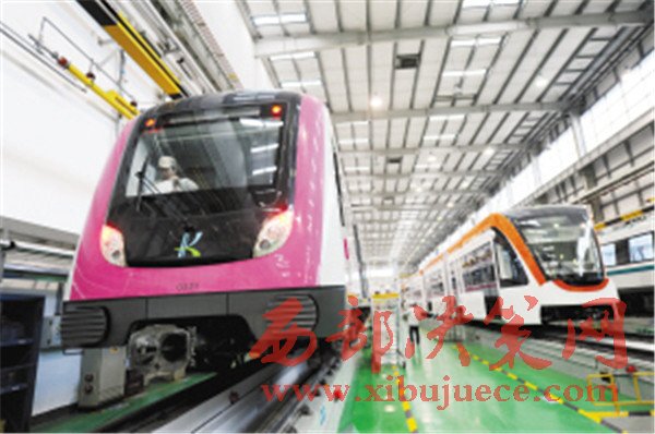 在生產(chǎn)車間,記者看到,3號線列車以粉紅色和白色為主要基調(diào),6號線列車以藍(lán)色和白色為主要基調(diào)。和昆明已經(jīng)投入運(yùn)營的列車一樣,剛出爐的列車也是B型車,車頭上同樣標(biāo)有代表昆明的字母“K”,而且有著軌道樣式的變形。值得一提的是,昆明中車公司正在調(diào)試的3號線此前已和市民見過面,而此次亮相的6號線列車可以說是首次出現(xiàn)在公眾視野,因?yàn)榇饲?號線運(yùn)行使用的列車是從1、2號線首期調(diào)用的。