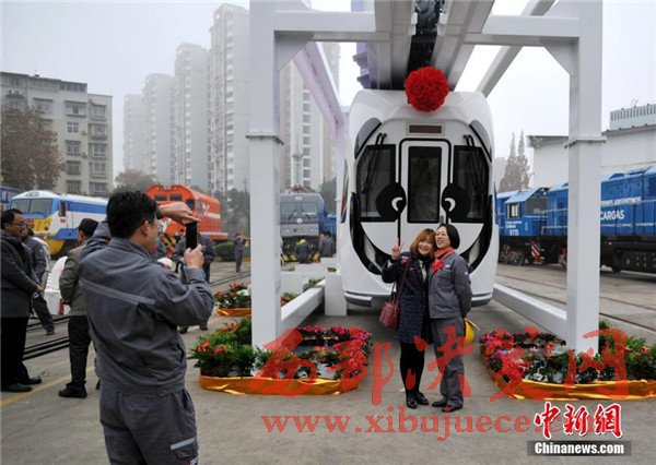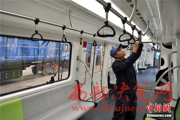 記者在現(xiàn)場(chǎng)看到,正式下線的空鐵車身為卡通熊貓山水圖案,酷似“熊貓”,每列定員144人,時(shí)速最高可達(dá)65公里。列車采用“大容量動(dòng)力蓄電池充放電控制技術(shù)”,通過實(shí)現(xiàn)高倍率放電,提高列車起動(dòng)加速性能及對(duì)極限環(huán)境的適應(yīng)性,同時(shí)能將400千瓦的電制動(dòng)功率全部用于動(dòng)力電池快速充電,實(shí)現(xiàn)制動(dòng)能量回收再利用,延長蓄電池續(xù)航里程達(dá)120千米。圖為車身外繪制有熊貓山水圖案。