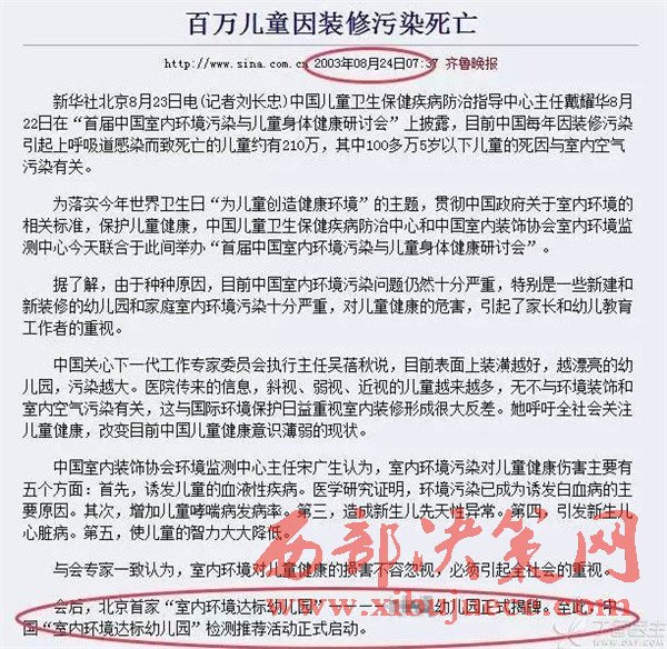 鐘南山在演講中引用了中國(guó)環(huán)境保護(hù)協(xié)會(huì)有關(guān)統(tǒng)計(jì)資料:90%白血病患兒家中曾進(jìn)行過(guò)豪華裝修,每年210萬(wàn)兒童死于豪華裝修;80%的家庭裝修甲醛超標(biāo);70%孕婦流產(chǎn)和環(huán)境污染有關(guān);每年我國(guó)因室內(nèi)環(huán)境污染引起的死亡人數(shù)高達(dá)11.1萬(wàn)人。室內(nèi)環(huán)境污染已經(jīng)成為嚴(yán)重影響現(xiàn)代人類健康的殺手之一。