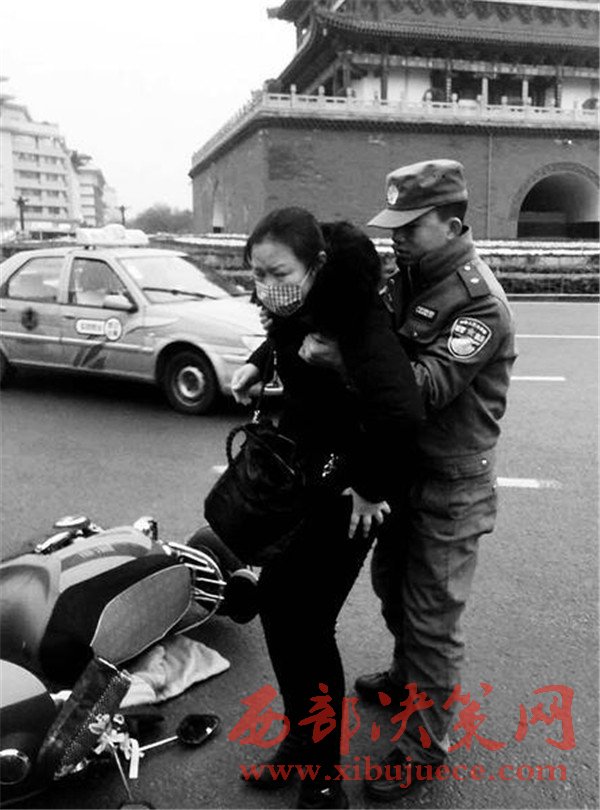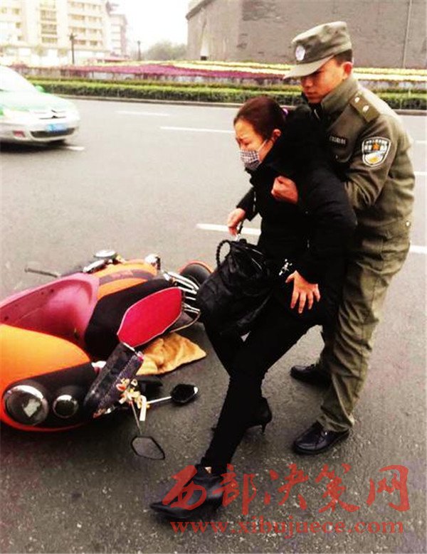 昨天17時(shí)10分,碑林區(qū)城市管理局柏樹林中隊(duì)執(zhí)法隊(duì)員馬奔和張翼在鐘樓開元商城區(qū)域正常開展巡查時(shí),突然看見一名中年女子騎著電動(dòng)車路過鐘樓十字右拐過程中,被一輛轎車撞了一下,緊接著,騎車的中年女子連人帶車倒在地上,肇事車輛當(dāng)場(chǎng)逃逸。