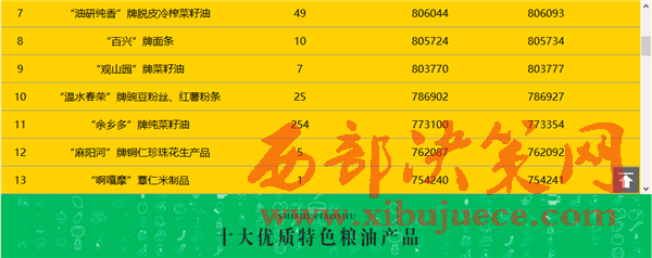 余慶縣大涼山米業(yè)有限責(zé)任公司的“大涼山”香米,貴州赫章縣黔豐蕎業(yè)有限公司的“黔豐”牌苦蕎系列產(chǎn)品,印江土家族苗族自治縣騰飛米業(yè)有限責(zé)任公司的“大圣墩”牌大米,貴州油研純香生態(tài)糧油科技有限公司的“油研純香”牌脫皮冷榨菜籽油,納雍縣百興鎮(zhèn)白泥屯特色產(chǎn)品有限公司的“百興”牌面條,貴州省貴定縣古鎮(zhèn)香糧油有限公司的“觀山園”牌菜籽油,習(xí)水縣春榮食品加工廠的“溫水春榮”牌豌豆粉絲、紅薯粉條七個產(chǎn)品也憑借優(yōu)異的表現(xiàn)躋身前十。遵義地區(qū)糧油產(chǎn)品占據(jù)前十名三個席位,黔南、畢節(jié)、銅仁各有兩個糧油產(chǎn)品躋身前十,六盤水一個產(chǎn)品入圍十強(qiáng)。