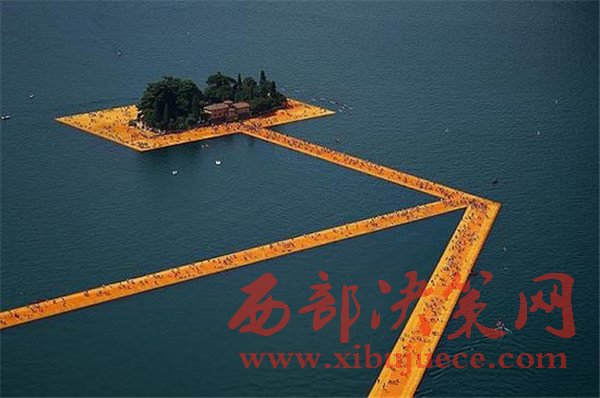 當代概念藝術家Christo因開拓土地藝術而聞名。在他最新的項目漂浮碼頭中,Christo搭建了很多亮黃色的小路,邀請意大利Sulzano的居民和游客步行通勤至別的導語。和Christo的其他裝置一樣,漂浮碼頭作品中的其他地方景觀也扮演著重要的角色。“湖周圍的山脈提供了鳥瞰該作品的地點,展現(xiàn)了那些之前沒被注意的角度”,他解釋道。“水、風、太陽,都是這個項目的一部分。”