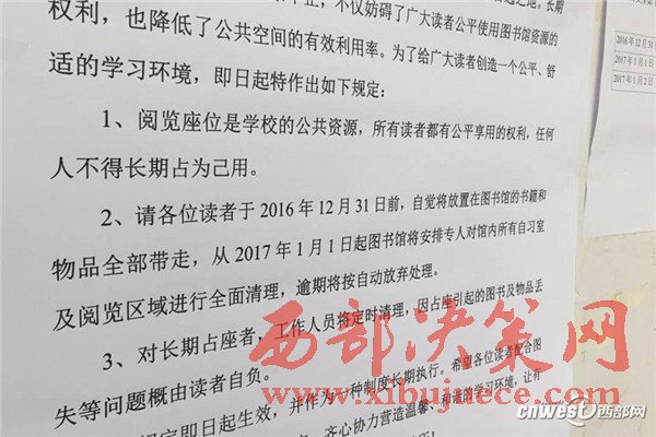 記者看到就在圖書館的入口貼著圖書館關(guān)于清理閱覽室座位的通知,上門寫著因?yàn)轲^內(nèi)占座問(wèn)題屢禁不止,請(qǐng)同學(xué)們?cè)?2月31號(hào)前將自己的物品帶走,從1月1號(hào)起將全面清理閱覽室,通知貼出的時(shí)間是12月28號(hào)。