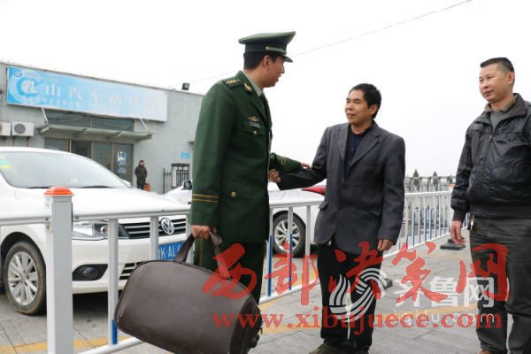 1月9日,周開(kāi)樹在南黃邊防派出所為母親開(kāi)具無(wú)戶籍證明后,然后帶母親來(lái)到青島,當(dāng)天下午坐上了青島至成都的火車,坐在火車上,周開(kāi)樹的眼前又浮現(xiàn)出當(dāng)年的情景,一個(gè)11歲的少年,緊緊拉著母親的手:“媽媽,您別走,長(zhǎng)大后我養(yǎng)活您……”圖為周開(kāi)樹與南黃邊防派出所民警見(jiàn)面。