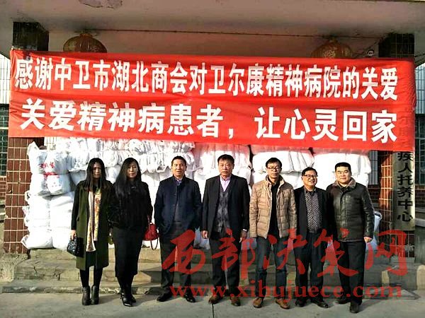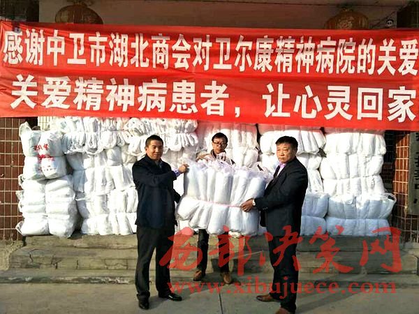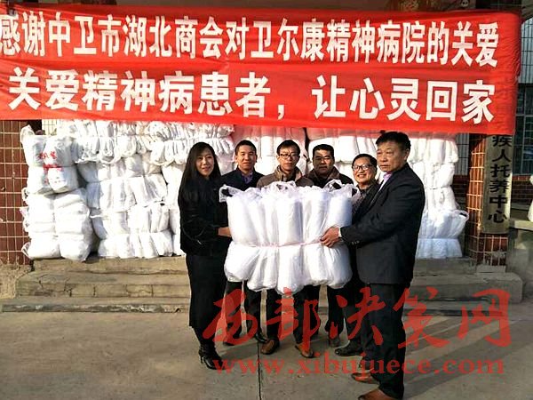 西部決策網訊(黃貞 楊新)2017年1月9日,中衛(wèi)市湖北商會一行數(shù)人在會長朱秀東的帶領下,前往中衛(wèi)市衛(wèi)爾康精神病醫(yī)院進行新年前慰問,并送去價值2萬余元的過冬棉被。
