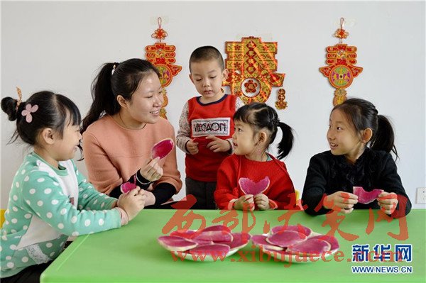 2月3日,河北省邢臺市橋東區(qū)三義廟社區(qū)大學(xué)生村官王廈(左二)在給小朋友講“咬春”的典故。