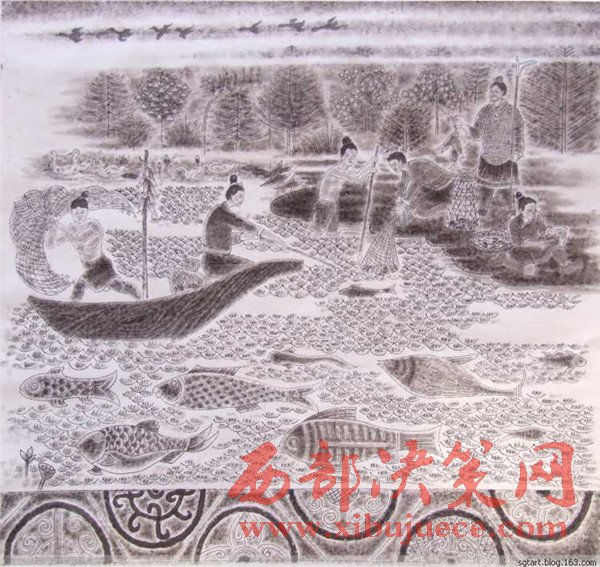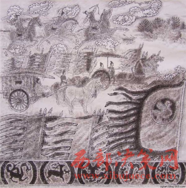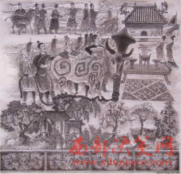 曹老經(jīng)過深思熟慮后1989年作出第一幅石鼓畫像,但他并不滿意。石鼓文的博大精深、源遠(yuǎn)流長豈能是他輕易能描繪得出來的!他覺得自己還沒有吃準(zhǔn)石鼓文的深邃含義。他明白:淺薄自滿是藝術(shù)的致命傷,能對自己自省和不滿的人,才會創(chuàng)作出能經(jīng)得起時間和歷史檢驗的藝術(shù)佳作。曹老痛下心撕了又畫,兩易其稿后,心里還不踏實,他必須尋找“最為挑剔的眼睛”。于是,他帶著十幅畫作,趕赴京城,讓石鼓專家鑒定審核。果不其然,專家們給他指出了一些問題:畫的時間不對,人物衣著不符合朝代特征。曹老虛心聽取了專家的意見,他返回寶雞,廢棄了原稿,重新考證人物的歷史特征,生活細(xì)節(jié)的一點一滴。他為了能精確地描繪先秦時期的人物和服飾,甚至每一件物件、器皿、圖案,他借來了秦兵馬俑博物館的圖像和資料,依據(jù)兵馬俑中人物的衣著打扮,紋飾車馬,2000年之后,第三次拿起筆重新準(zhǔn)確地描繪出了十面石鼓中的眾多人物、眾多民俗風(fēng)情。為了讓《石鼓文圖》經(jīng)受更嚴(yán)格的“審批”,曹老并沒有急于發(fā)表,而是連續(xù)奔波了幾年,直到2007年終于定稿與世人見面。