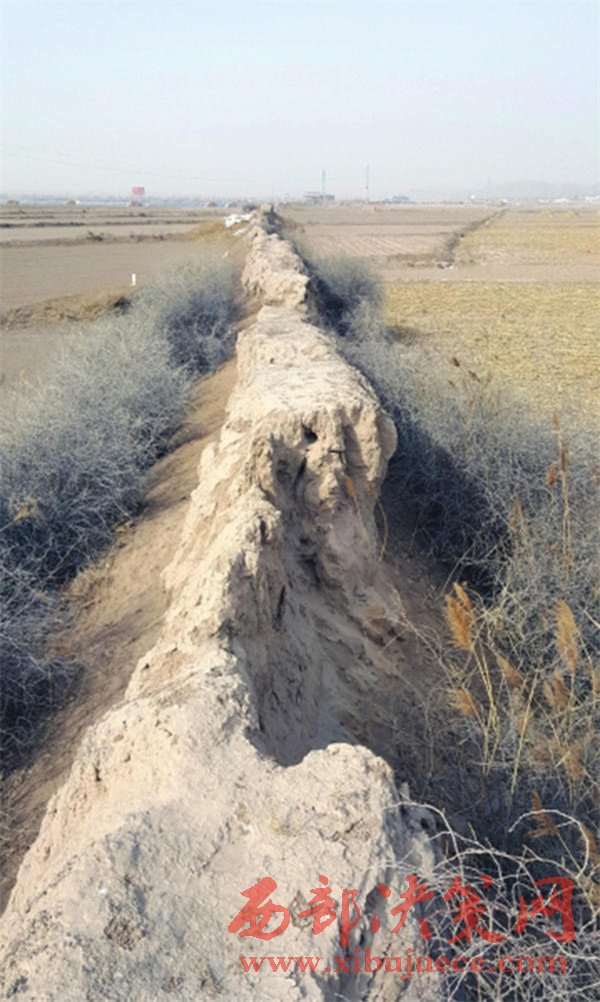 省政府立的明長城景泰段全國重點文物保護(hù)碑。 本文圖均為 甘肅日報 圖春節(jié)期間,記者來到這段明長城后看到,這段由黃土夯筑而成的長城,在歷經(jīng)400多年的風(fēng)雨侵蝕和人為破壞后,已成為斷斷續(xù)續(xù)、高低不一的“土壟子”。即便間或殘存有一大段連續(xù)的城墻,也被兩側(cè)的農(nóng)田“啃噬”得只剩下一兩米高寬。