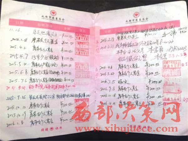 從賑災捐款,到為愛助醫(yī),從公眾熟知的“提燈女孩”王思培,到無人注意的早產(chǎn)雙胞胎,成都慈善總會為廖弟友發(fā)放的捐款證書上,每一頁都記著受助者的名字和個人基金的用途。翻看捐款證書,僅從2011年3月到2016年12月這段時間內(nèi),廖弟友的捐款次數(shù)達到58次,最近一次是2016年12月存入個人慈善基金的記錄。