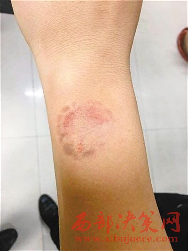 中隊民警翟偉、秦偉在將楊某帶離車輛的過程中,楊某突然咬住民警翟偉的左手腕處,經(jīng)民警現(xiàn)場多次警告仍不松口,在隨行輔警等人協(xié)助下,最終將楊某帶離車輛進行了尿液檢測,而民警翟偉的左手腕處卻留下了清晰的牙印。