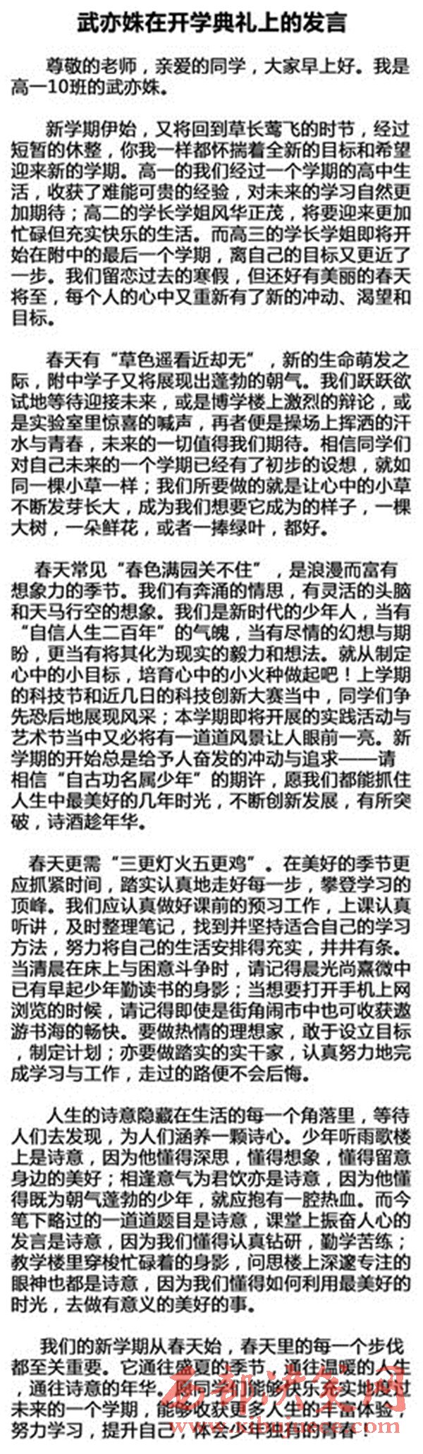 據(jù)復(fù)旦附中官網(wǎng),中小學(xué)紛紛舉行開學(xué)典禮。16日上午,復(fù)旦大學(xué)附屬中學(xué)2016學(xué)年第二學(xué)期開學(xué)典禮隆重舉行。榮獲中央電視臺(tái)第二季中國詩詞大會(huì)全國總冠軍的文理學(xué)院學(xué)生武亦姝上臺(tái)發(fā)言。