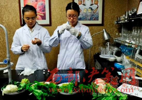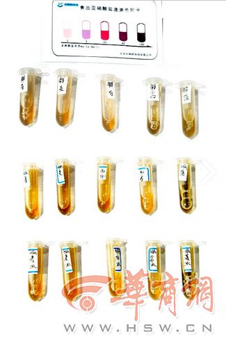 華商報(bào)記者在市場(chǎng)上購(gòu)買(mǎi)了新鮮的菠菜,白菜,小白菜,油麥菜,青菜,拿到西安營(yíng)養(yǎng)學(xué)會(huì),專家通過(guò)實(shí)驗(yàn)的方法,檢測(cè)新鮮蔬菜、冰箱存放48小時(shí)的蔬菜、常溫存放48小時(shí)的蔬菜中亞硝酸鹽含量的變化。