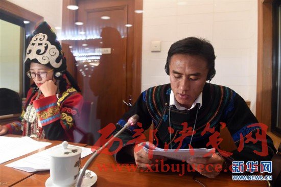 3月5日,民族語文翻譯組工作人員瓦其金強(qiáng)(右)在人民大會(huì)堂對(duì)十二屆全國人大五次會(huì)議開幕會(huì)進(jìn)行同聲傳譯。