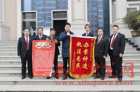 西部決策網(wǎng)訊(帥華鋒 劉恒)3月20日上午,鳳翔大千汽車(chē)租賃有限公司總經(jīng)理王某專(zhuān)程送來(lái) “辦案神速 執(zhí)法為民”的錦旗與感謝信,向鳳翔法院執(zhí)行一庭干警王宏斌及執(zhí)行局全體干警表達(dá)謝意,感謝他們?cè)谵k案中不辭辛苦,公正執(zhí)法,有力的維護(hù)了當(dāng)事人合法權(quán)益。