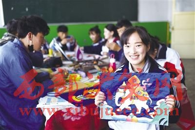 3月20日,青海省黃南藏族自治州職業(yè)技術(shù)學(xué)校民間傳統(tǒng)工藝系學(xué)生關(guān)吉展示自己正在制作的一幅堆繡作品。