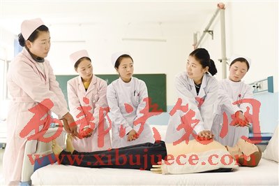 3月20日,青海省黃南藏族自治州職業(yè)技術(shù)學(xué)校護(hù)理系老師李美榮(右二)在給學(xué)生講授心肺復(fù)蘇方法技巧。
