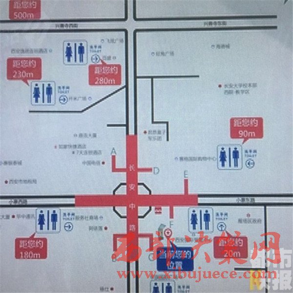 在這個指示牌的地圖上,除了標(biāo)注出“所在位置”以及周邊的標(biāo)志性地點,還醒目的標(biāo)出了周圍的衛(wèi)生間地點。圖上標(biāo)明,在小寨十字,周圍一共有七個可用衛(wèi)生間,最遠(yuǎn)的一個距離280米,最近的一個距離只有20米。