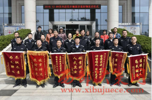 當(dāng)日,陳倉公安分局現(xiàn)場向來自甘肅省會寧縣的受害群眾宋某芳和來自寶雞市千陽縣的受害群眾邢某俠等7名群眾共計發(fā)放被騙贓款170000余元。當(dāng)宋某芳等7名群眾從該局局長楊會軍和政委苗寶平手中領(lǐng)到被騙的現(xiàn)金時喜極而泣,不時的連聲說“感謝公安局、感謝公安民警、真是謝謝啦”,有的群眾面向公安民警和媒體記者深深鞠躬表達(dá)謝意,并將七面繡著“人民衛(wèi)士、破案神速,為民服務(wù)、匡扶正義”等內(nèi)容的大紅錦旗增送到民警手中,表達(dá)心中的謝意。受害群眾被騙的款數(shù)從數(shù)千元到數(shù)萬元不等,最高達(dá)50000余元。