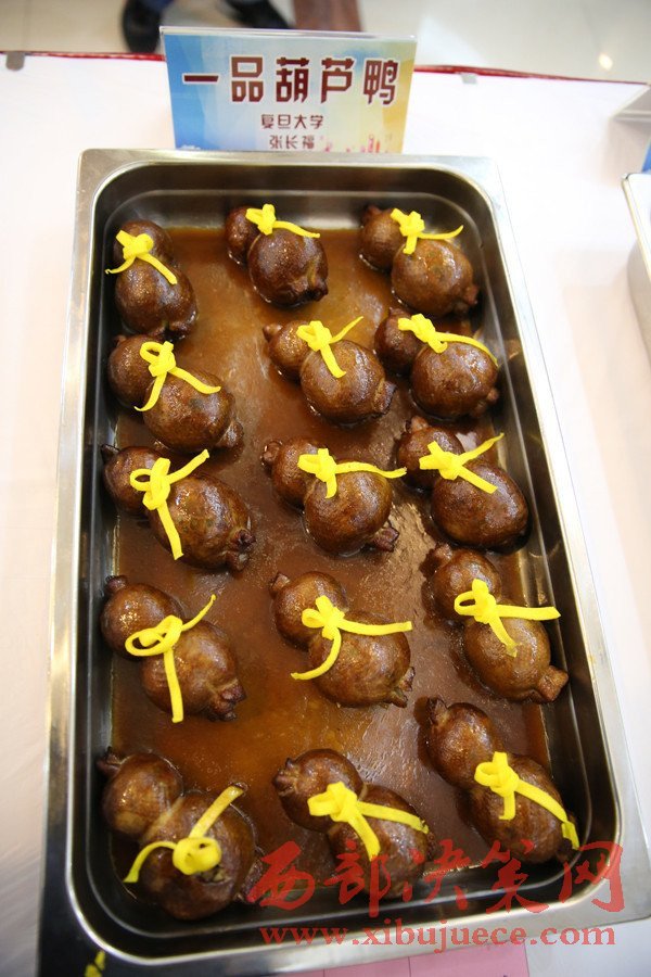 在長(zhǎng)達(dá)數(shù)個(gè)小時(shí)的比賽中,來(lái)自37所上海高校的100多位廚師輪流上陣,共制作出菜品111個(gè)。圖為復(fù)旦大學(xué)一品葫蘆鴨。