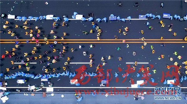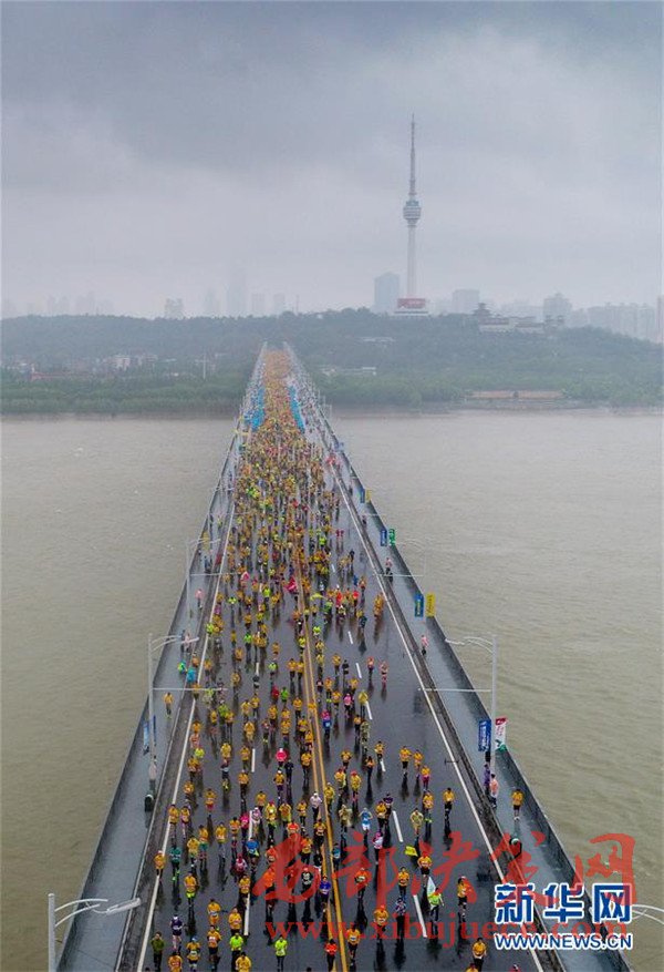 當(dāng)日,2017武漢馬拉松在雨中鳴槍開跑。武漢馬拉松因穿越漢江、長江、東湖,橫跨包括武漢長江大橋在內(nèi)的多座橋梁而備受馬拉松愛好者追捧。