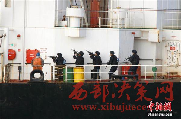 圖為特戰(zhàn)隊(duì)員快速登入商船展開營救活動(dòng)。