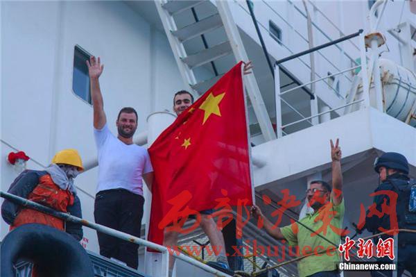 圖為商船“OS35”船員興奮地披上五星紅旗。