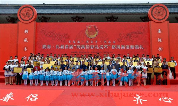 5月7日,甘肅隴南禮縣秦文化廣場(chǎng)上人潮如海,喜氣洋洋。倍受社會(huì)關(guān)注的隴南市首屆“向高價(jià)彩禮說(shuō)不”移風(fēng)易俗新婚禮在這里隆重舉行。來(lái)自禮縣各鄉(xiāng)鎮(zhèn)精準(zhǔn)扶貧戶(hù)中的30對(duì)新人以隆重儉樸的新婚儀式喜結(jié)連理,見(jiàn)證了彼此的愛(ài)情。