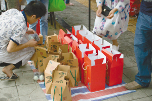 馬鞍東路“粽子江湖”的歷史大致要追溯到上世紀(jì)80年代。1980年,居住在馬鞍東路的李太婆,把自己包的粽子拿到院壩門口和附近的曹家巷農(nóng)貿(mào)市場(chǎng)賣,受到她的啟發(fā),“馬婆婆”周啟玉(隨夫姓,下同)拉著“梅婆婆”葉新芳和“任婆婆”張興碧籌劃起了粽子生意。那年開始,端午時(shí)節(jié),成都馬鞍東路的“婆婆粽”漸漸名聲在外。如今的馬鞍東路,到端午節(jié)前半個(gè)月就熱鬧開來(lái)。裁縫鋪、火鍋店、面館……臨街的商鋪都在這個(gè)時(shí)節(jié)改賣粽子。