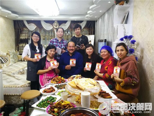 傍晚,一大群來自不同民族,不同單位的新疆兒女聚在了一起,紛紛加入到這個民族團結(jié)的大聚會里,彈一首歡快悅耳的冬不拉,舞一曲深情優(yōu)美的賽乃姆,唱一首民族團結(jié)的贊歌,將整個聚會推向高潮。賽買提·阿合買提高興地說:“我今天太開心了!這個結(jié)婚紀念日太有意義了,你的親戚,我的親戚,變成了我們的親戚,以后這就是你們的家,你們要經(jīng)常來??!” 趁著大家都在興頭上,韓莉書記又拿出學校專門印制的《不忘初心 牢記使命-黨的十九大精神進校園讀本》,熱情地為親戚們宣傳起十九大精神,給大家講起黨的好政策來。在得知艾來提·賽買提目前還沒有找到合適的工作,沒有穩(wěn)定收入的情況后,大家立刻表示愿意幫助他早日找到合適的工作,幫助他們解決最實際的困難,把溫暖送到他們的心坎中。大家唱唱跳跳,說說笑笑,其樂融融,在互幫互助中讓民族團結(jié)之花越開越艷。