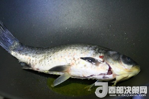 5、鍋里倒入少許油,燒熱后,放入清理干凈的魚,小火慢慢煎。