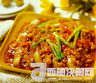 3、鍋內(nèi)留油,下入姜米、肉泥、茄子、雞湯、鹽、味精、白糖、老抽王,用小火燒至汁濃時(shí)再用濕生粉勾芡,淋麻油即成。