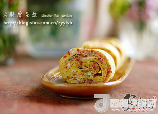 7.重復(fù)第6步驟,直到蛋液全部用完(每次倒蛋液的時候,都攪拌一下,不要讓火腿末等沉在碗底,鍋?zhàn)硬徽承Ч玫脑挘恍枰_始時抹一次油即可,覺得粘的話,中途也可以抹油)。