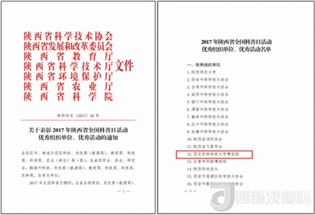 近日,陜西省科協(xié)、省發(fā)改委、省教育廳、省科技廳、省環(huán)保廳、省農(nóng)業(yè)廳和省科學(xué)院聯(lián)合發(fā)布了《關(guān)于表彰2017年陜西省全國科普日活動(dòng)優(yōu)秀組織單位、優(yōu)秀活動(dòng)的通知》,西北農(nóng)林科技大學(xué)博覽園獲評2017年全國科普日活動(dòng)優(yōu)秀組織單位。