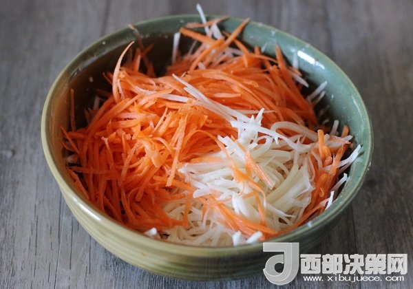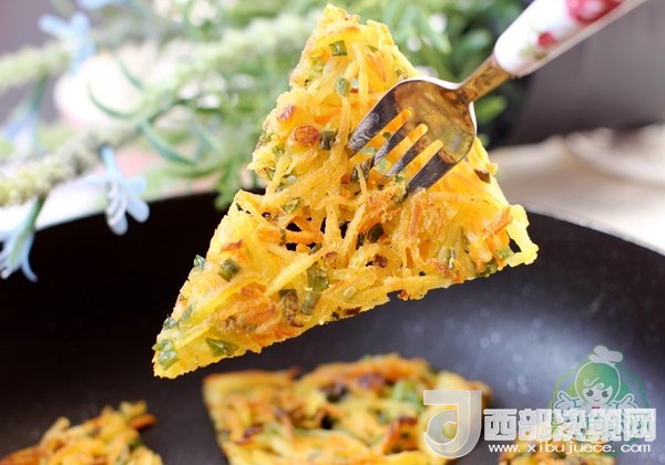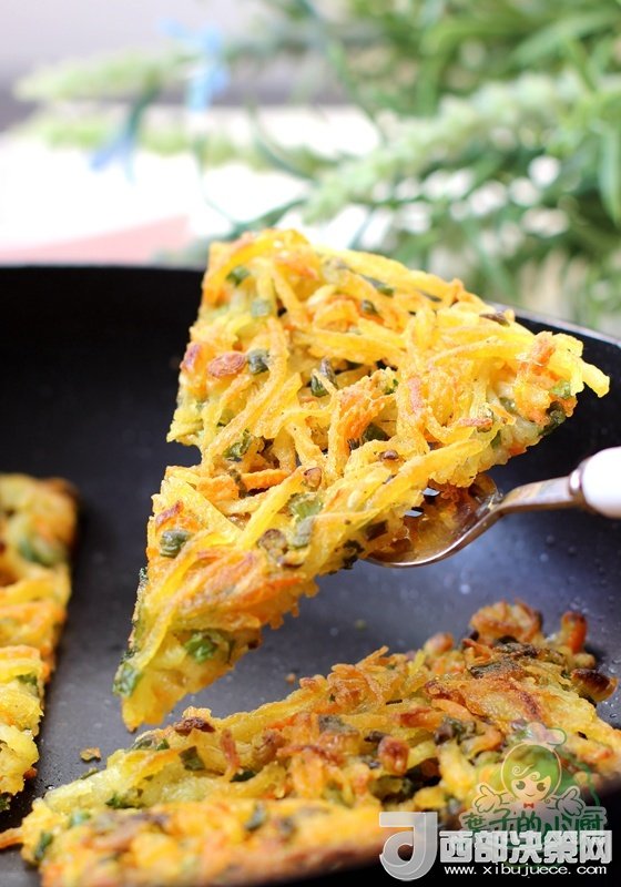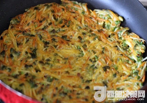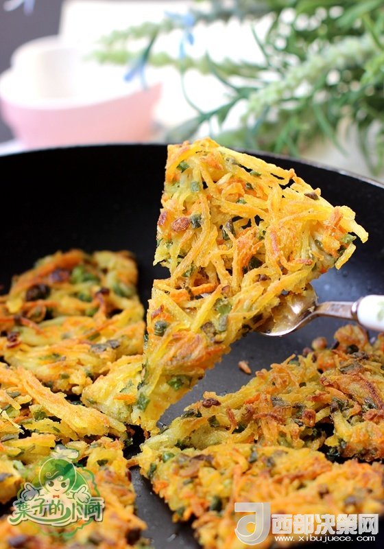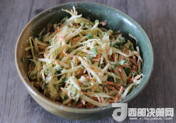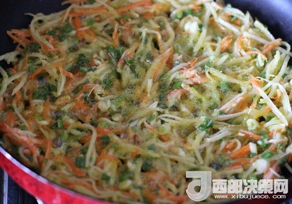 土豆和胡蘿卜用刨絲器刨成絲。
