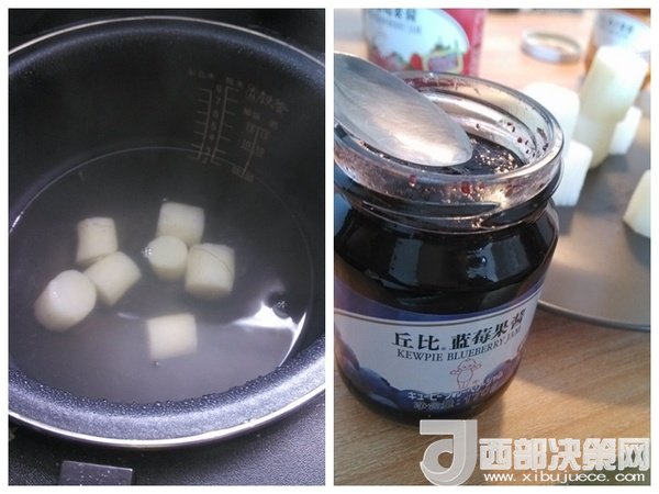 3、繼續(xù)煮到全熟;4、然后切好裝盤,其中一個(gè)淋上藍(lán)莓果醬;
