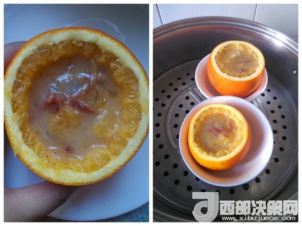 4、比較大的一半橙子挖去其中二分之一厚度的橙子肉;