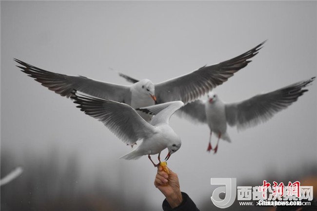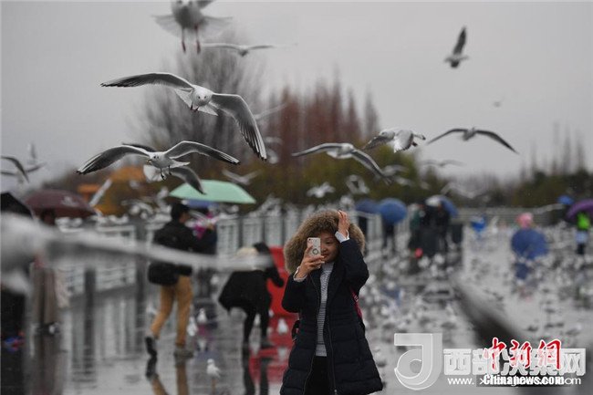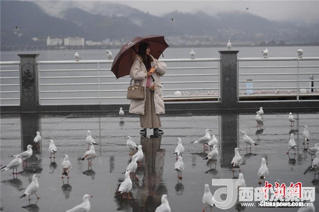 1月3日,紅嘴鷗在滇池邊與游客親密接觸。當(dāng)日,“春城”昆明淅淅瀝瀝的小雨下個(gè)不停,仍有眾多游客和市民來到滇池邊,與西伯利亞的“白色精靈”——紅嘴鷗相會,領(lǐng)略昆明別樣美景。(記者 劉冉陽 攝)