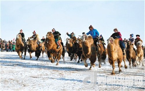 這邊還沒有欣賞完駱駝的高大靜美,馬隊的馳騁再次讓觀眾熱血沸騰。一縱疾馳的駿馬驕傲地?fù)P著頭顱,鬢毛高高飛起,厚重的積雪并沒有減慢馬兒奔跑的速度,雪團(tuán)如碎銀一般在它們腳下飛灑,而騎手們紅綠藍(lán)各異的蒙古皮袍也分外吸引眼球。緊接著還有射箭、駱駝拉爬犁等精彩表演。