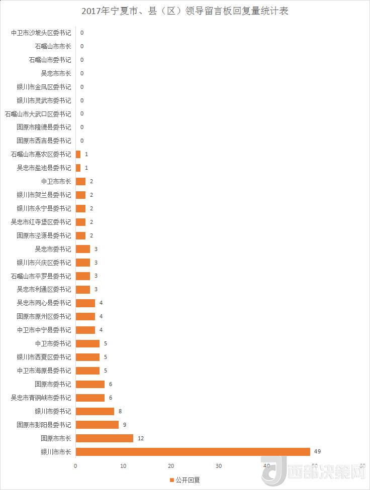 37位一把手中9位全年0條回復,分別為1位市委書記、2位市長和6位縣(區(qū))委書記。地級市、縣(區(qū))黨政一把手公開回復量為0的一把手分別為:石嘴山市委書記、石嘴山市市長、吳忠市市長、銀川市金鳳區(qū)委書記、銀川市靈武市委書記、石嘴山市大武口區(qū)委書記、固原市隆德縣委書記、固原市西吉縣委書記、中衛(wèi)市沙坡頭區(qū)委書記。