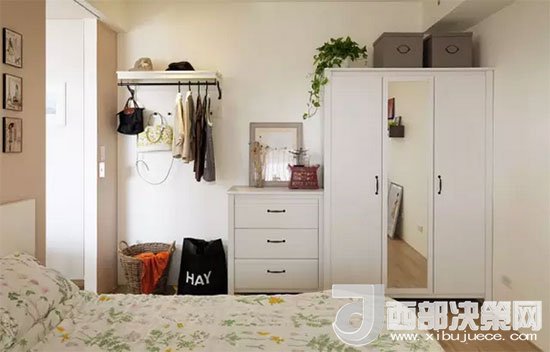 藤筐、收納箱、掛衣桿、衣柜,各種收納工具一應(yīng)俱全,搭配得十分得宜。衣柜中間柜門上安裝了全身鏡。對于不愿把鏡子放進臥室的房友們來說,不知道這樣子布置會不會稍好一些。
